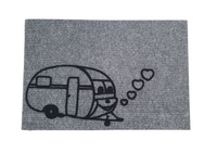 Wycieraczka Campingowa "I Love Caravan" 60x40 cm - Szara imitacja trawy, motyw przyczepy – antypoślizgowa, zewnętrzna i wewnętrzna